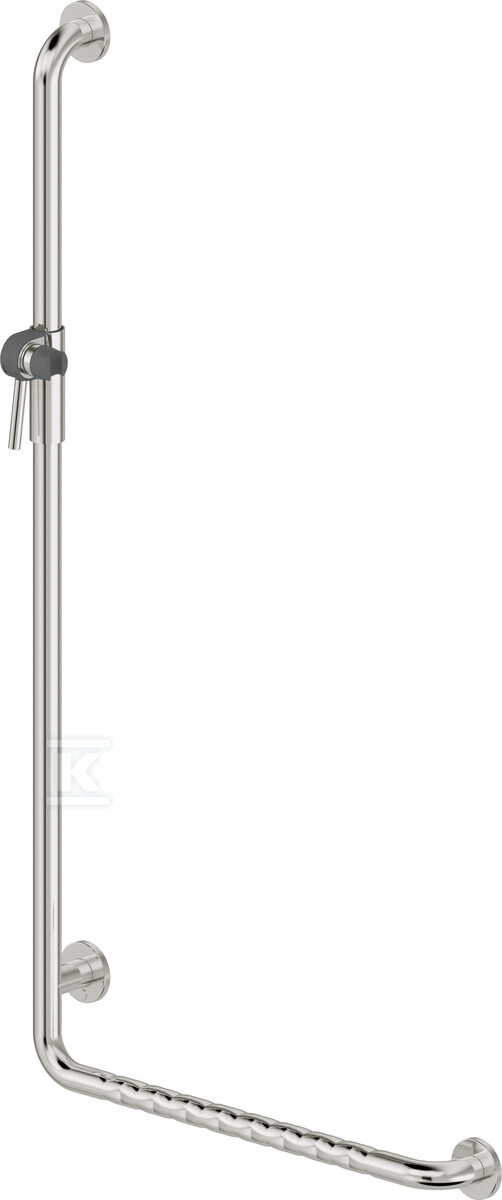 Тримач характеризується продуманою конструкцією. Поєднання вертикальної та горизонтальної рами, розташованих на різних висотах, полегшує вставання з ванни або туалету. Виготовлений з нержавіючої сталі з полірованим покриттям кольору антрациту, він стійкий до корозії та простий у догляді. Хвиляста поверхня горизонтальної рами забезпечує надійний хват навіть у вологих умовах. Крім того, регульований тримач для душової лійки збільшує функціональність продукту.