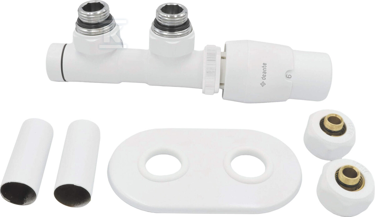 Клапан має правосторонню кутову фігуру, що означає, що його слід монтувати праворуч від радіатора (головка на звороті), коли подача гарячої води знаходиться зліва. Підключення PEX та різьба G3/4” забезпечують герметичне та безпечне з’єднання з установкою. У комплект входять дві маскуючі втулки та два адаптери/з’єднувачі, що полегшує монтаж та забезпечує естетичний вигляд.