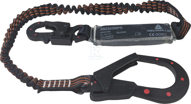 Амортизатор оснащений петлями з каушею для зміцнення конструкції та засувкою AM010D і гаком AM022D, що полегшують кріплення до обв'язки та точок кріплення. Виготовлений з поліестеру, він характеризується високою стійкістю до розтягування та стирання, що перекладається на тривалий термін служби та надійність. Чорно-червона колірна гама покращує видимість і полегшує ідентифікацію.