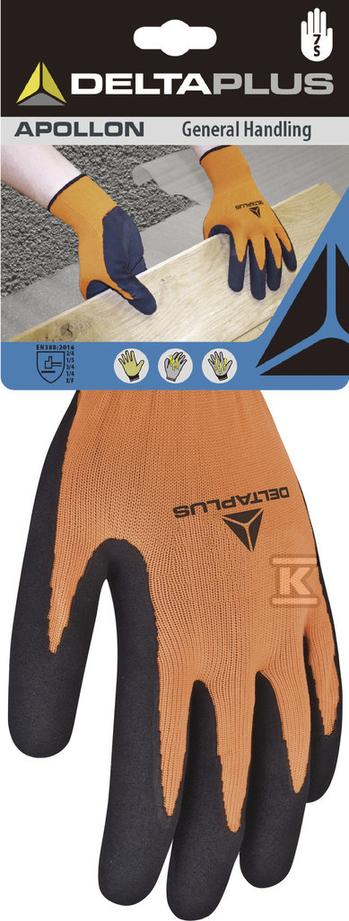 Рукавички побудовані з в'язаного поліестеру 100%, що забезпечує легкість і гнучкість. Щільність в'язки 13 впливає на міцність і прилягання до руки. Долоня покрита латексною піною, яка забезпечує відмінне зчеплення, навіть у вологих умовах. Натуральний латекс є еластичним і добре пристосовується до форми руки, мінімізуючи втому під час роботи. Флуоресцентний помаранчево-чорний колір підвищує видимість користувача, що підвищує безпеку в умовах обмеженої видимості.