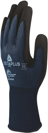 Ці рукавички вирізняються використанням перероблених матеріалів – аж 54% поліестеру отримано з відходів. Це екологічне рішення не впливає негативно на експлуатаційні властивості. Щільність в'язки 18 гарантує точне виконання та прилягання до рук, що перекладається на комфорт роботи навіть під час тривалого використання. Поєднання нітрилу та поліуретану в покритті забезпечує стійкість до олій, мастил та деяких хімічних речовин. Вкладка рукавички виготовлена з суміші переробленого поліестеру, поліестеру та спандексу, що забезпечує зручність і повітропроникність.