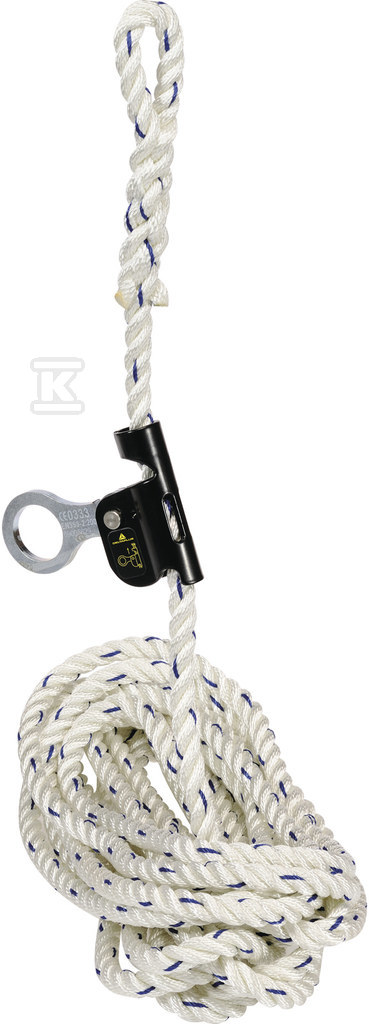 Пристрій фабрично закріплений на 10-метровій скрученій лінії діаметром 12 мм. Ліна, виготовлена з поліаміду, характеризується високою міцністю на розтягнення та стійкістю до стирання, що гарантує тривале використання навіть у складних умовах. Верхня частина лінії закінчена петлею, що полегшує монтаж та інтеграцію з системою страхування. Корпус пристрою виготовлений зі сталі нержавіючої, що забезпечує стійкість до корозії та механічних пошкоджень. Вбудований індикатор зносу інформує про необхідність заміни пристрою, що підвищує рівень безпеки використання.