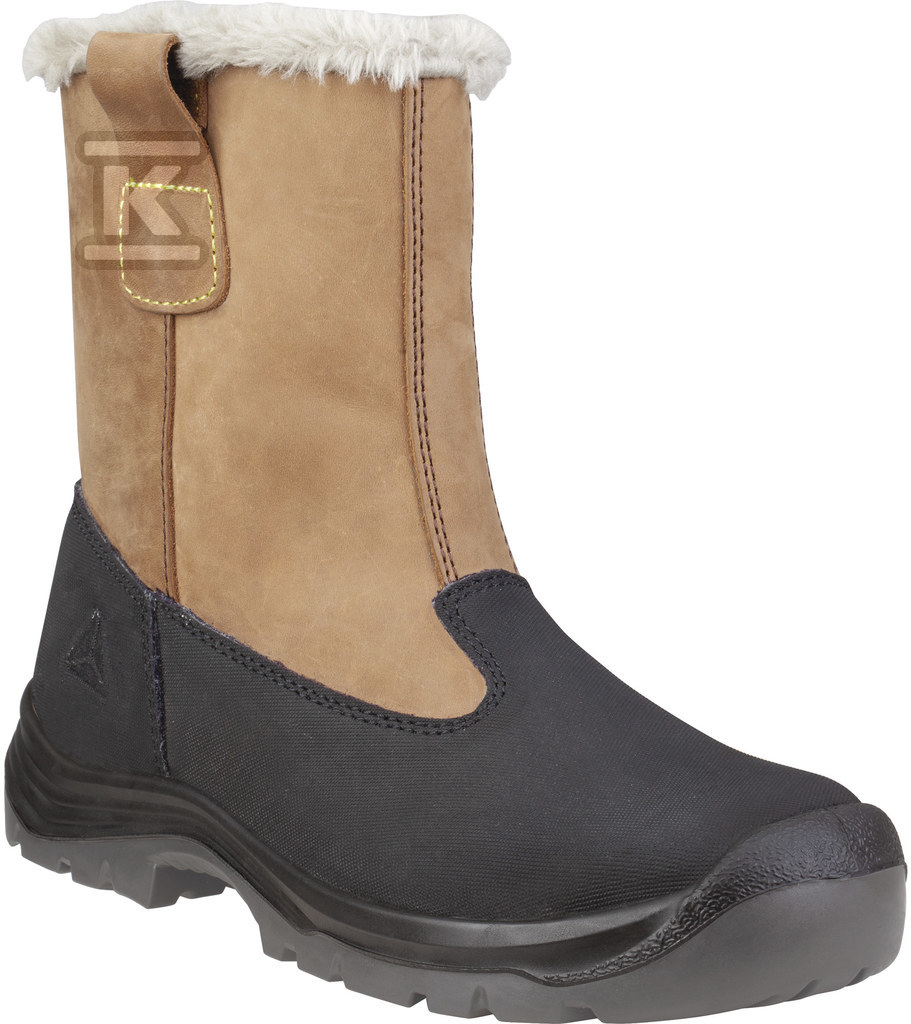 Верх, виготовлений з високоякісної яловичої шкіри, обробленої водонепроникним покриттям S3, забезпечує стійкість до вологи та механічних пошкоджень. Додатковий шар шкіряної замші, покритої PU, зміцнює конструкцію та підвищує довговічність взуття. Внутрішня підкладка з м'якого поліестерового хутра забезпечує тепло та комфорт навіть за низьких температур. Устілка, виготовлена з поліестеру на EVA, є змінною та попередньо сформованою, що дозволяє адаптувати її до індивідуальної форми стопи та забезпечує амортизацію під час ходьби.