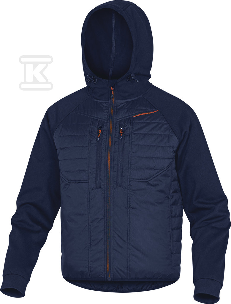 Блуза виконана з двох матеріалів. Застібка на приховану блискавку. Стягувачі на манжетах. 5 кишень. Тканина: пікована, поліамід Ripstop з поліуретановим покриттям.Вставки: поліестер, 2 шари ламіновані.Підкладка: поліестер тафта. Колір: Темно-синьо-помаранчевий. Розмір: M