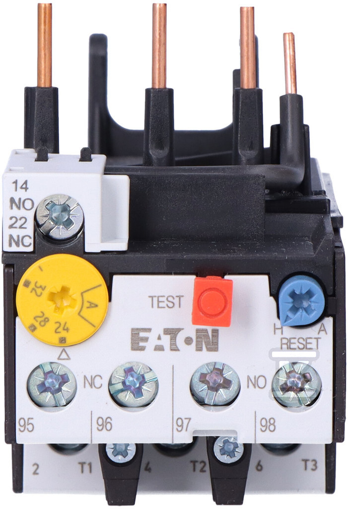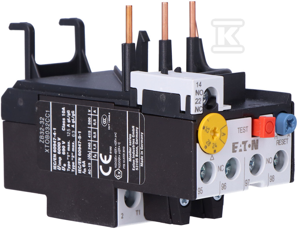 Захисне реле двигуна для прямого монтажу в контакторах розмірів DILM17 до DILM38 або для індивідуального монтажу з основою, чутливість до фазового відключення відповідно до IEC/EN 60947, VDE0660 T.102, підходить для захисту двигунів EEx, клас спрацьовування 10A, монтаж на клемах, інтерфейс 690 В, ступінь захисту IP20, захист від пальців відповідно до EN50274 з вертикальним переднім приводом, пристрої для всіх ринків, схвалені для використання на борту