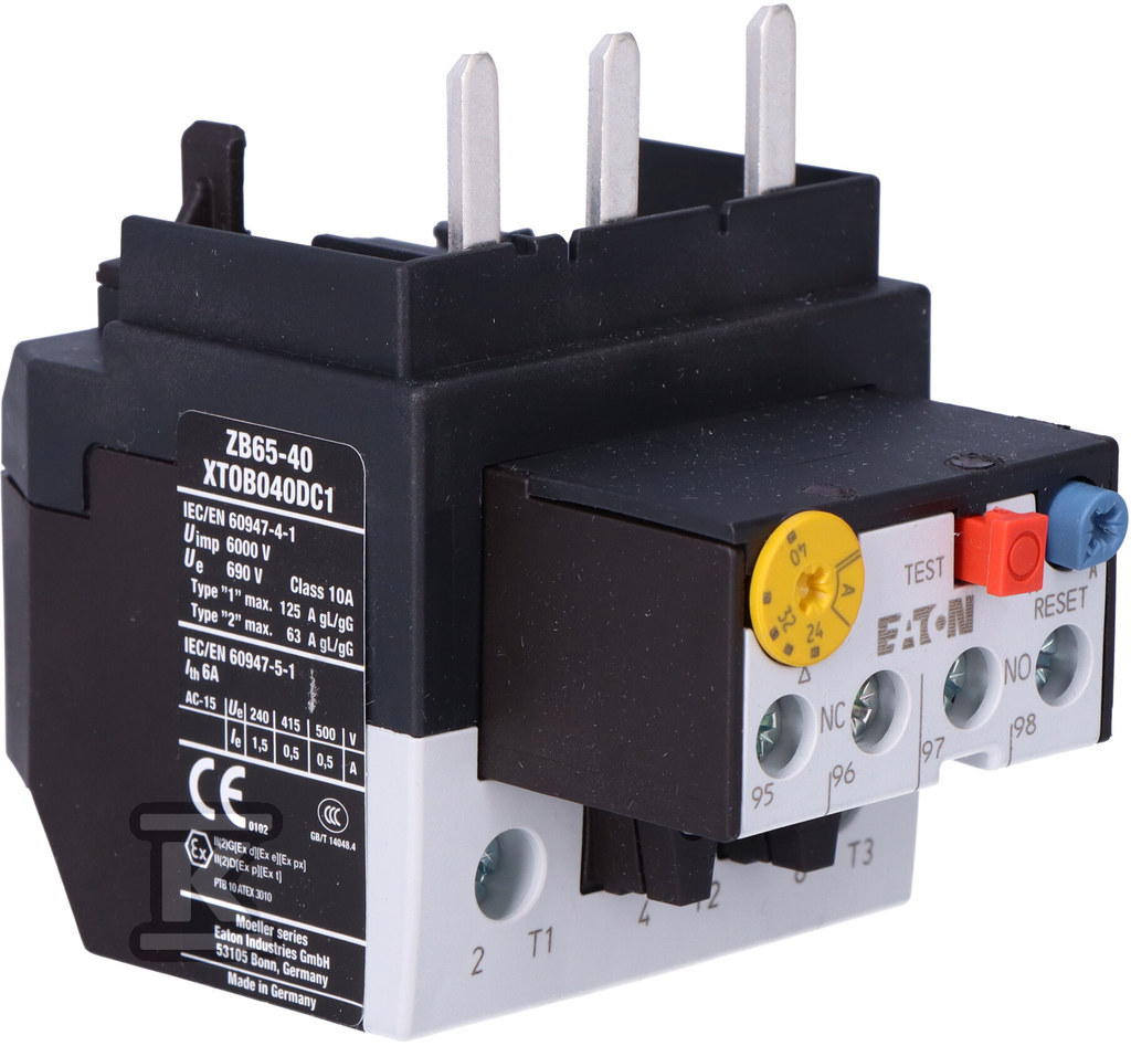 Захисне реле двигуна для прямого монтажу в контакторах розмірів DILM40 до DILM72 або для індивідуального монтажу з основою, чутливість до відсутності фази відповідно до IEC/EN 60947, VDE0660 T.102, підходить для захисту двигуна EEx, клас спрацьовування 10A, монтаж на клемах, інтерфейс 690 В, ступінь захисту IP00, захист від пальців відповідно до EN50274 з вертикальним переднім приводом, пристрої для всіх ринків, схвалені для використання на борту