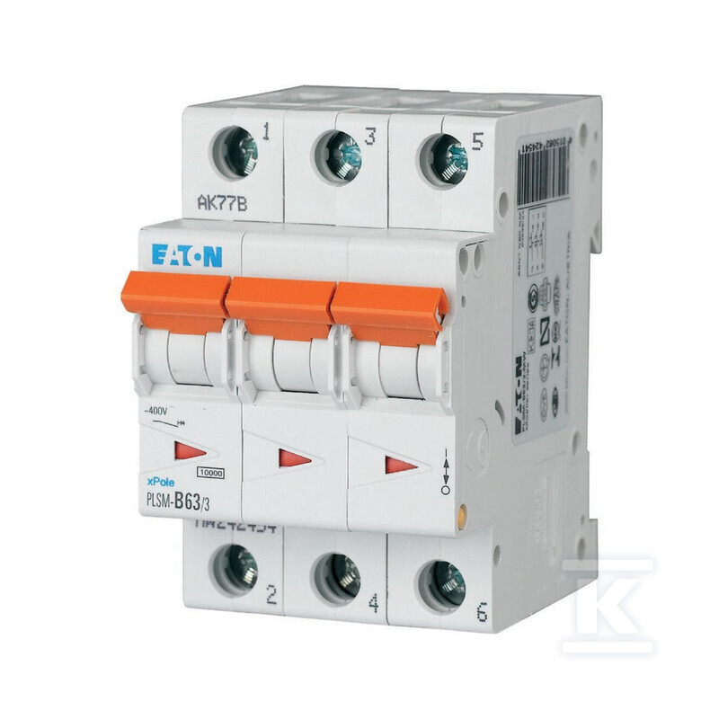 Вимикач надструму PLSM-C63/3-MW – це триполюсний захист, призначений для захисту електричних ланцюгів з номінальним струмом 63A. Характеризується високою здатністю відключення короткого замикання – аж 10kA, що гарантує ефективну реакцію у випадку виникнення небезпечних перенапруг. Виготовлений відомою фірмою EATON, забезпечує безпеку та надійність дії в різноманітних застосуваннях.