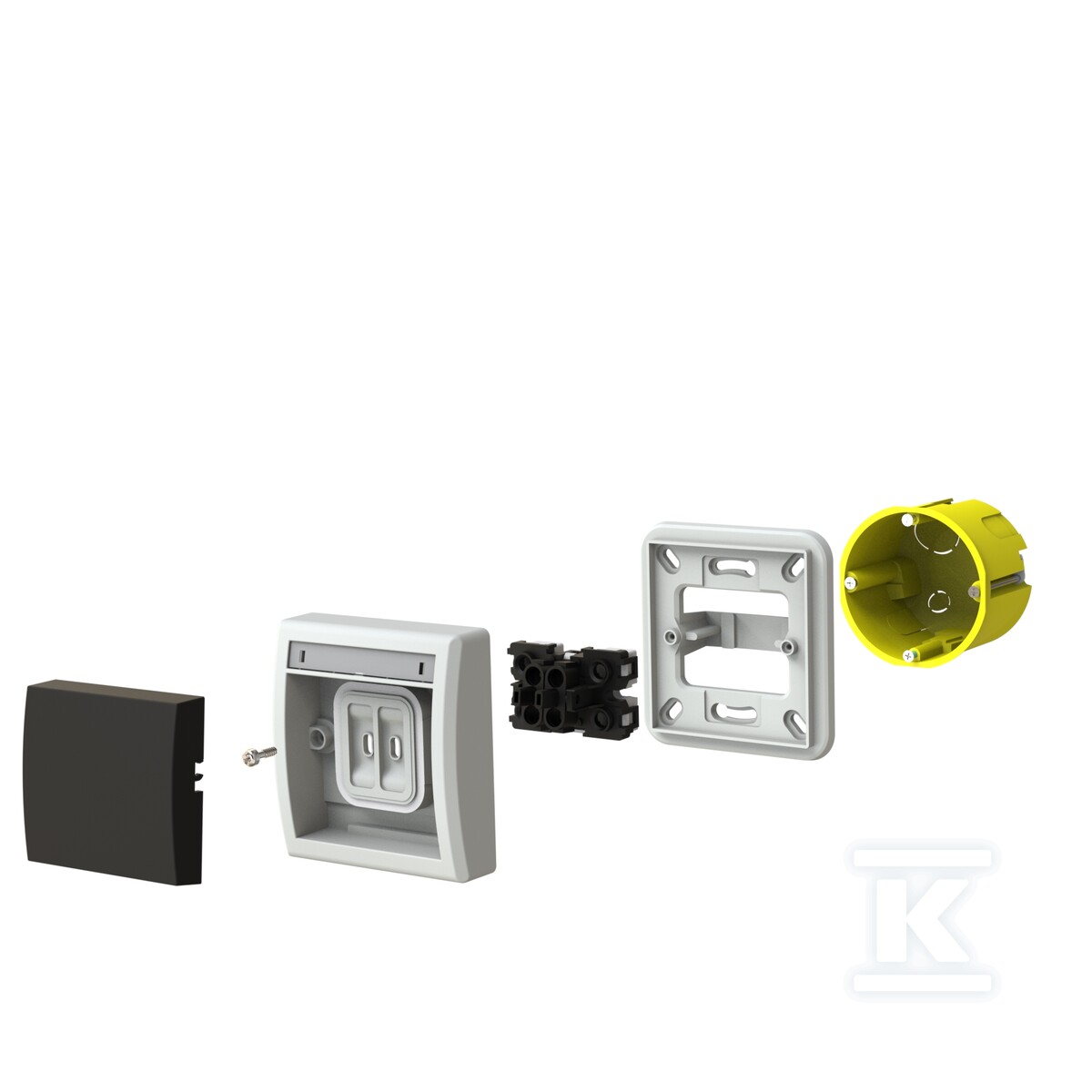З'єднувач може працювати як стандартний однополюсний з'єднувач для ввімкнення/вимкнення освітлення з одного місця або як перемикач сходинок, що дозволяє керувати освітленням з двох точок. Підтичковий монтаж забезпечує естетичний вигляд інсталяції. Підключення проводів відбувається за допомогою зручних гвинтових затискачів. У комплекті є візитниця для опису кола, що полегшує ідентифікацію функції з'єднувача. Продукт відповідає вимогам норми PN-EN-60669-1:2018-04 та має номінальний струм 10AX/250V~. Колір корпусу – сірий RAL 7035/7016, що полегшує адаптацію до оточення. Розміри з'єднувача – 87x91x48mm.