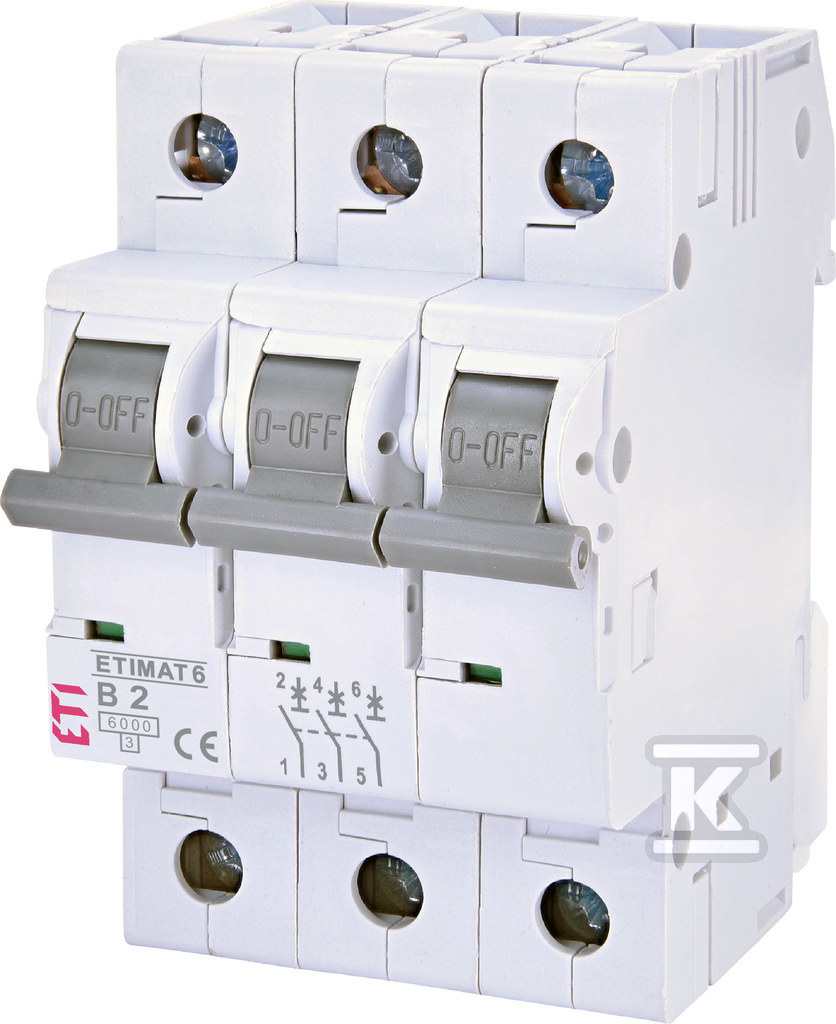 Вимикач ETIMAT 6 3P B2 характеризується номінальним струмом 2A та характеристикою вимкнення типу B. Це означає, що він швидко реагує на збільшення струму, але є більш толерантним до короткочасних стрибків, що особливо важливо при підключенні пристроїв з електродвигунами або іншими споживачами з великим пусковим струмом. Номінальна здатність вимкнення короткого замикання (Icn) становить 6 kA як при напрузі 230 V, так і 400 V, що забезпечує ефективний захист у разі виникнення короткого замикання. Вимикач має 3 захищені полюси та призначений для монтажу на шині TH35 шириною 3 модулі.