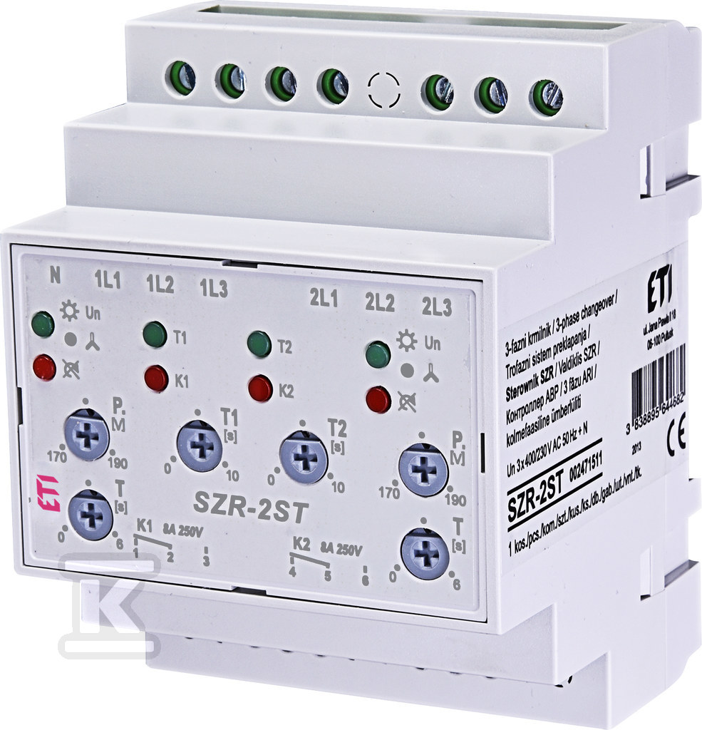 Контролер SZR-2ST знаходить застосування в схемах самостійного ввімкнення резерву (SZR), де автоматичне перемикання на аварійне живлення є необхідним для забезпечення безперервної роботи пристроїв. Завдяки компактним розмірам – займає лише 4 модулі на шині TH35 – його легко інтегрувати з існуючою електричною інфраструктурою. Пристрій особливо корисний в трифазних установках, де стабільність живлення має ключове значення. Додаткові регулювальні ручки в моделі SZR-2ST дозволяють точно налаштувати поріг напруги та час затримки перемикання до специфічних вимог застосування.