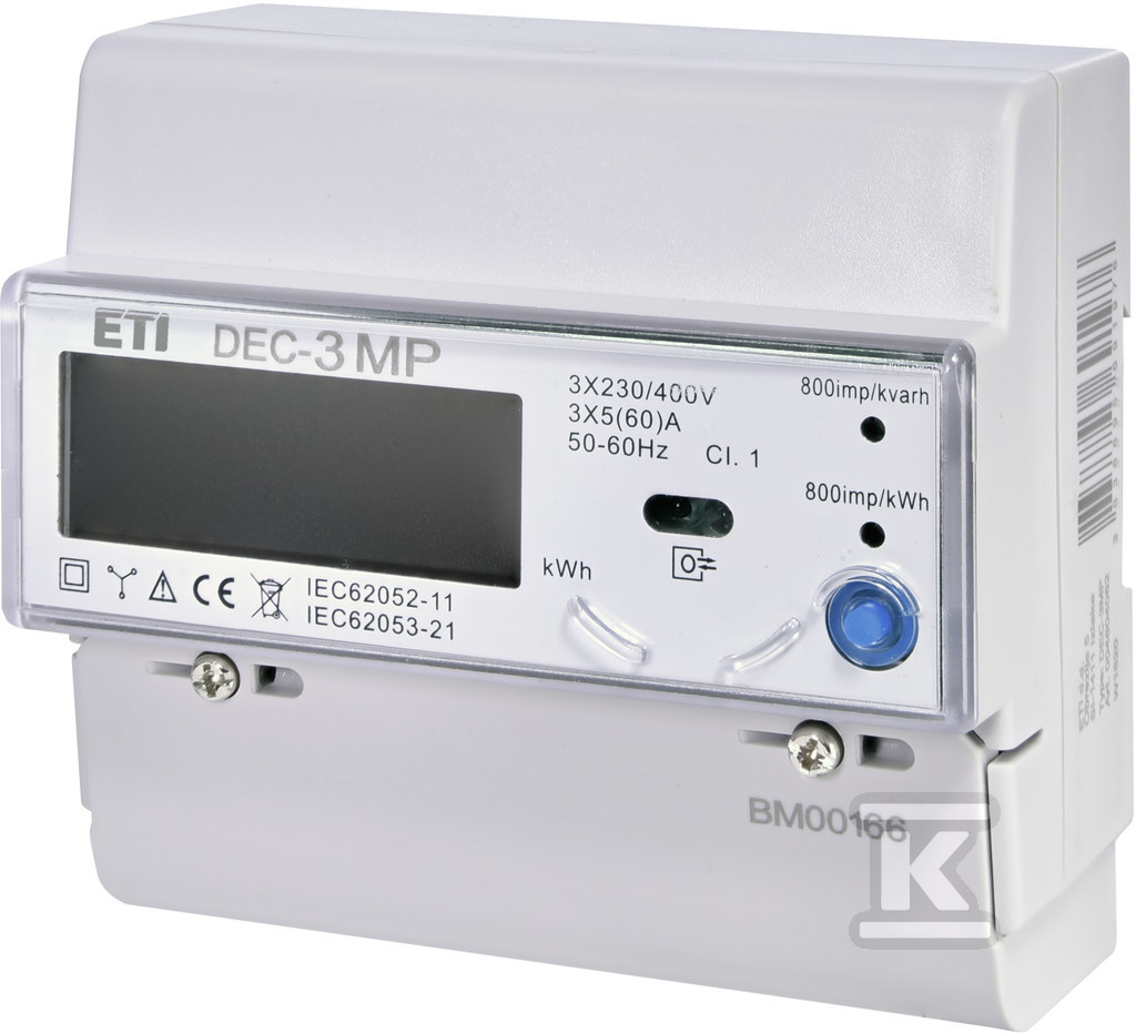 Лічильник DEC-3MP – це електронний вимірювач енергії в прямому підключенні, розроблений для показів та реєстрації спожитої електричної енергії. Його конструкція, заснована на прямому вимірюванні, усуває необхідність використання додаткових струмових трансформаторів, що спрощує монтаж та знижує витрати на установку. Комунікація здійснюється за допомогою інтерфейсу RS-485, що забезпечує віддалене зчитування даних та інтеграцію з системами управління енергією. Лічильник має блокування відкату лічильника, що забезпечує цілісність даних вимірювань. Додатково сигналізує про споживання енергії за допомогою миготіння світлодіодів – 800 імпульсів на кВт·год для активної енергії та 800 імпульсів на квар·год для реактивної енергії.