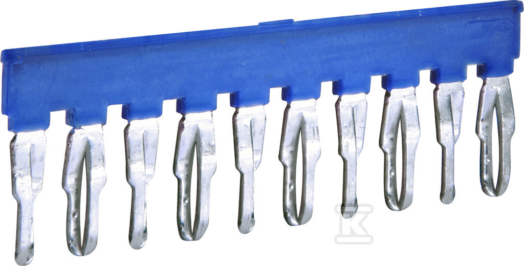 Цей 10-полюсний перемичковий з'єднувач, позначений синім кольором, є практичним рішенням для з'єднання електричних ланцюгів. Він дозволяє легко та швидко створювати поперечні з'єднання на розподільчих шинах, що сприяє економії часу під час встановлення. Його конструкція забезпечує надійність та безпеку використання.