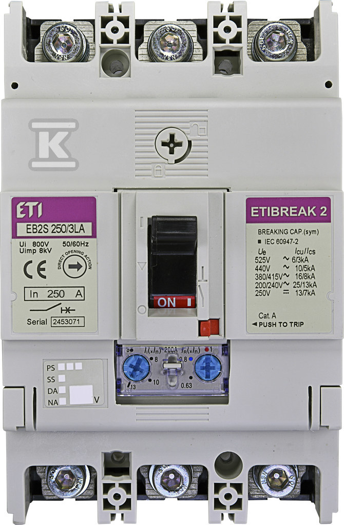 Вимикач потужності ETI EB2S 250/3LA – це триполюсний пристрій, призначений для захисту електричних установок від перевантажень і коротких замикань. Номінальний постійний струм 250A та висока здатність відключення короткого замикання 16kA роблять його ідеальним рішенням як для комерційних, так і для промислових застосувань. Він оснащений регульованим тепловим і магнітним випускачем, що забезпечує точний і надійний захист.