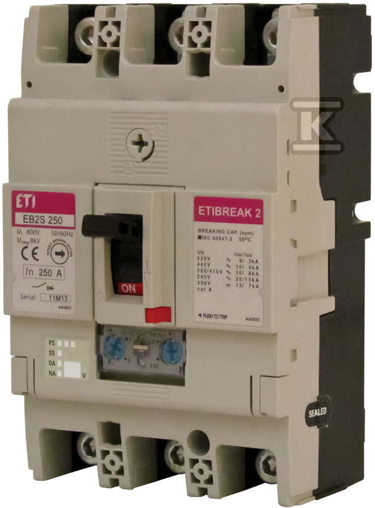 Вимикач EB2S 250/3HA призначений для стаціонарного монтажу. Його конструкція, заснована на гвинтових з'єднаннях, забезпечує надійне та довговічне з'єднання провідників. Завдяки вбудованому індикатору вимкнення, легко ідентифікувати стан пристрою після спрацювання захисту. Можливість підключення двигуна (опціонально) розширює функціональність вимикача, дозволяючи дистанційне керування.