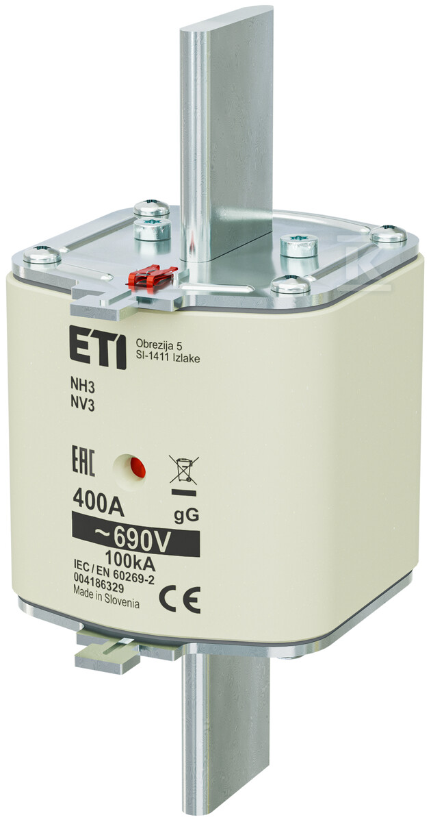 Ножовий запобіжник NH3 gG 400A/690V розроблено з урахуванням довговічності та ефективності. Виготовлений з високоякісного стеатиту (корпус), посрібленої латуні (контакти ножові) та алюмінію (кришки), забезпечує стійкість до корозії та термічну стабільність. Заповнення корпусу кварцовим піском спеціальної грануляції збільшує здатність відключення короткого замикання до 100 кА при напрузі 690V та забезпечує стабільність електричних параметрів. Додатково, патрон оснащений подвійним індикатором спрацювання – червоне око в центральній частині керамічного корпусу та пружна бляшка на верхній кришці – що полегшує швидку ідентифікацію перегорання. Цей тип індикатора також дозволяє співпрацювати з мікровимикачем NVS 5 для віддаленої сигналізації стану патрона.