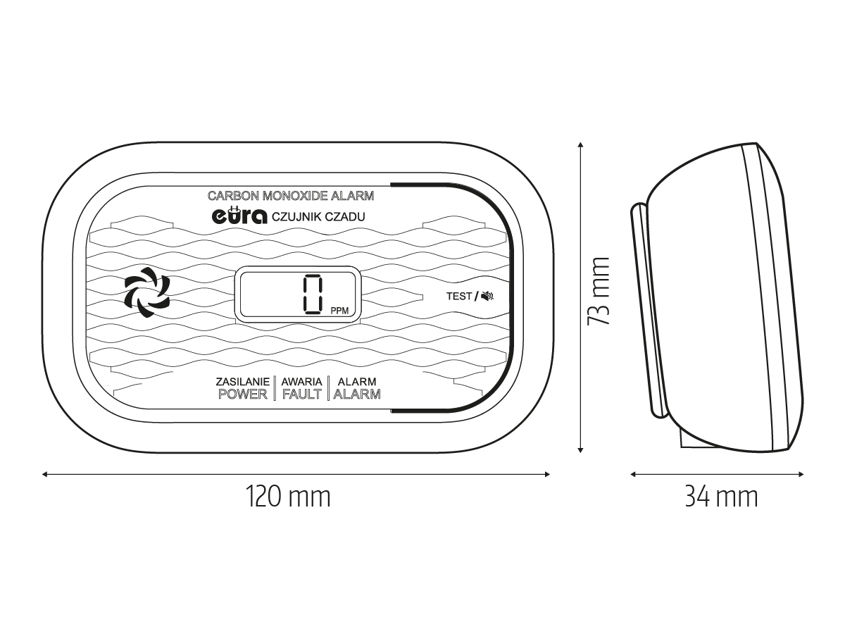 Датчик використовує електрохімічний сенсор з тривалим терміном служби – до 10 років – що мінімізує необхідність частої заміни пристрою. Електронний блок управління забезпечує високу точність вимірювань при низькому споживанні струму. У разі виявлення небезпечної концентрації монооксиду вуглецю, датчик негайно запускає акустичний та оптичний сигнал тривоги, а на рідкокристалічному дисплеї (LCD) відображається поточна концентрація газу.