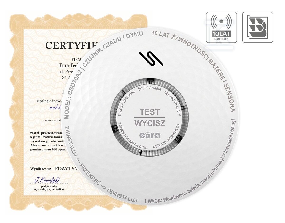 Датчик EURA CSD-39A2 вирізняється винятково тривалим терміном служби – як сенсори, так і літієва батарея вистачають на повні 10 років без необхідності заміни. Це означає відсутність додаткових витрат і впевненість, що пристрій буде постійно моніторити рівень чадного газу та диму протягом усього періоду експлуатації. Додатково, він має сертифікат CNBOP-PiB та відповідність нормам PN-EN 50291-1:2018 та EN 14604:2005/AC:2008, що підтверджує його високу якість та ефективність. Кожен екземпляр тестується в Польській Лабораторії Оксиду Вуглецю (тест 300 ppm), що гарантує його справність.