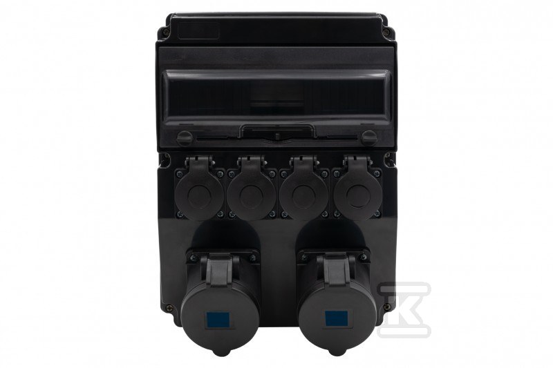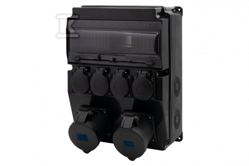 Корпус розподільного щита, виготовлений з ABS, забезпечує високу стійкість до механічних пошкоджень та зовнішніх факторів. Ступінь захисту IP66 гарантує безпеку використання навіть у складних умовах, захищаючи від пилу та струменя води. Кріплення кришки за допомогою гвинта з нержавіючої сталі додатково захищає від несанкціонованого доступу. Всередині розташовані прості гнізда з номінальним струмом 16A (3-полюсні) та 32A (3-полюсні) та чотири гнізда 230V, що дозволяє підключити широкий спектр пристроїв. Гнізда мають ступінь захисту IP44.