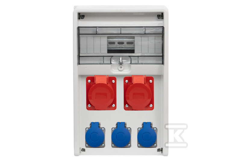 До комплекту постачання входять: один роз'єм 16A 5P, один роз'єм 32A 5P та чотири однофазні роз'єми 230V. Така конфігурація забезпечує універсальність застосування та можливість підключення різноманітних електричних приладів. Настінний монтаж простий та швидкий – достатньо використовувати шість гвинтів. Додатково, вікно в корпусі полегшує контроль стану перемикачів без необхідності відкривання розподільної коробки.