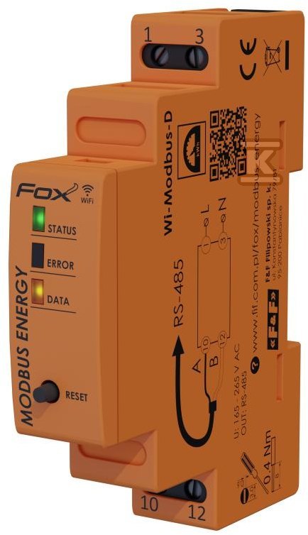 Інтегратор Modbus Energy, позначений номером WI-MODBUS-D, це пристрій, що розширює можливості лічильників енергії F&F, оснащених інтерфейсом Modbus RTU, дозволяючи інтеграцію з системою Fox. Це дає змогу реєструвати та візуалізувати споживання енергії та ключові параметри електричної мережі. Пристрій призначений для монтажу на шині 35mm і займає 1 модуль (18mm).