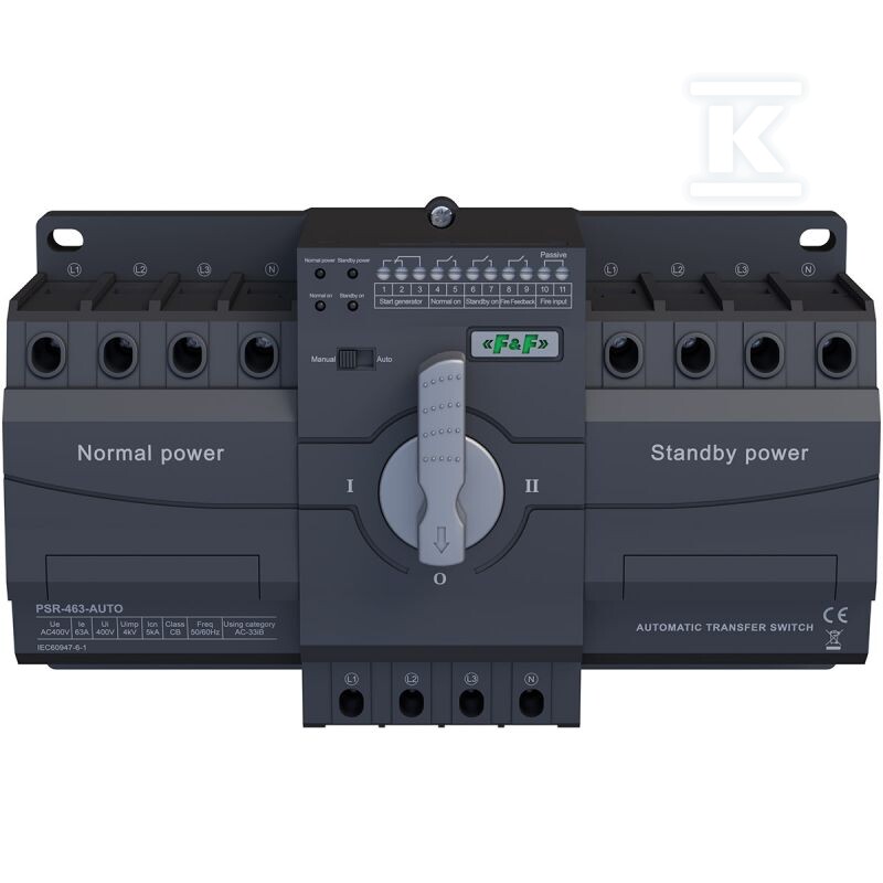 Перемикач PSR-463-AUTO дозволяє автоматичне перемикання живлення в мережах AC 50/60 Hz з напругою 230/400 V, підтримуючи струм до 63 A. Механічний захист унеможливлює одночасне ввімкнення обох джерел живлення, що гарантує безпеку інсталяції та обладнання. Завдяки розширеній функціональності, перемикач може бути керований зовнішнім генератором, має вхід безпеки для вимкнення живлення в аварійних ситуаціях та сигналізацію стану роботи. Можливість роботи в режимі Auto або Manual дає гнучкість адаптації до різних потреб користувача.