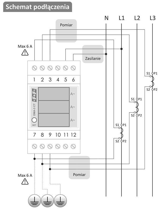 Індикатор розроблений для монтажу на DIN-рейку 35 мм, що полегшує його інтеграцію з існуючою електричною інфраструктурою. Завдяки компактним розмірам (3 модулі, тобто 52,5 мм завширшки) він не займає багато місця в розподільчому щиті. Призначений для співпраці зі струмовими трансформаторами з вихідним струмом 5A, що дозволяє гнучко адаптувати його до різних конфігурацій установки. Дисплей LED з трьома цифрами для кожної фази забезпечує чітке та інтуїтивно зрозуміле зчитування значення струму.