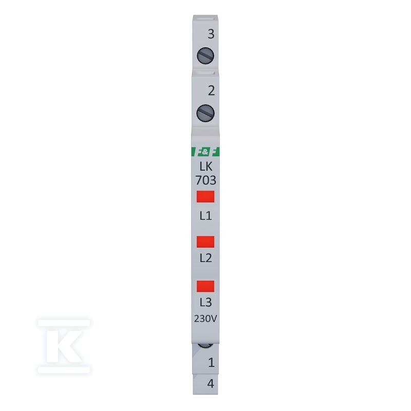 Лампочка LK-703R характеризується напругою живлення 3x230V+N та використовує три червоні світлодіоди для контролю живлення. Номінальний струм на канал становить 1 мА, а приєднання реалізується за допомогою гвинтових затискачів перерізом 2,5 мм², що затягуються моментом 0,4 Нм. Споживання потужності становить 0,15 Вт на канал, а температура роботи знаходиться в діапазоні від -30°C до +50°C. Пристрій має розміри 1/3 модуля (6,2 мм), монтується на шині 35 мм і має ступінь захисту IP20.