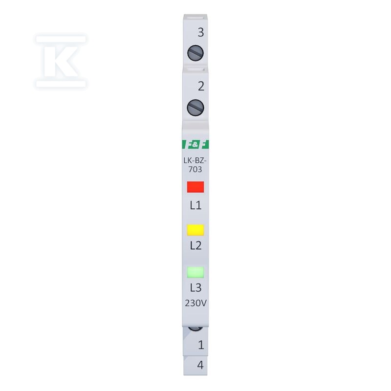 Лампка контролю живлення LK-BZ-703K – це компактний пристрій, призначений для оптичної сигналізації наявності напруги в трифазних мережах. Її невеликі розміри – всього 1/3 модуля (6,2 мм) – дозволяють заощадити місце в розподільчому щиті, що особливо важливо в тісних просторах. Пристрій сигналізує про наявність напруги в кожній фазі за допомогою трьох світлодіодів кольорів: червоного, жовтого та зеленого.