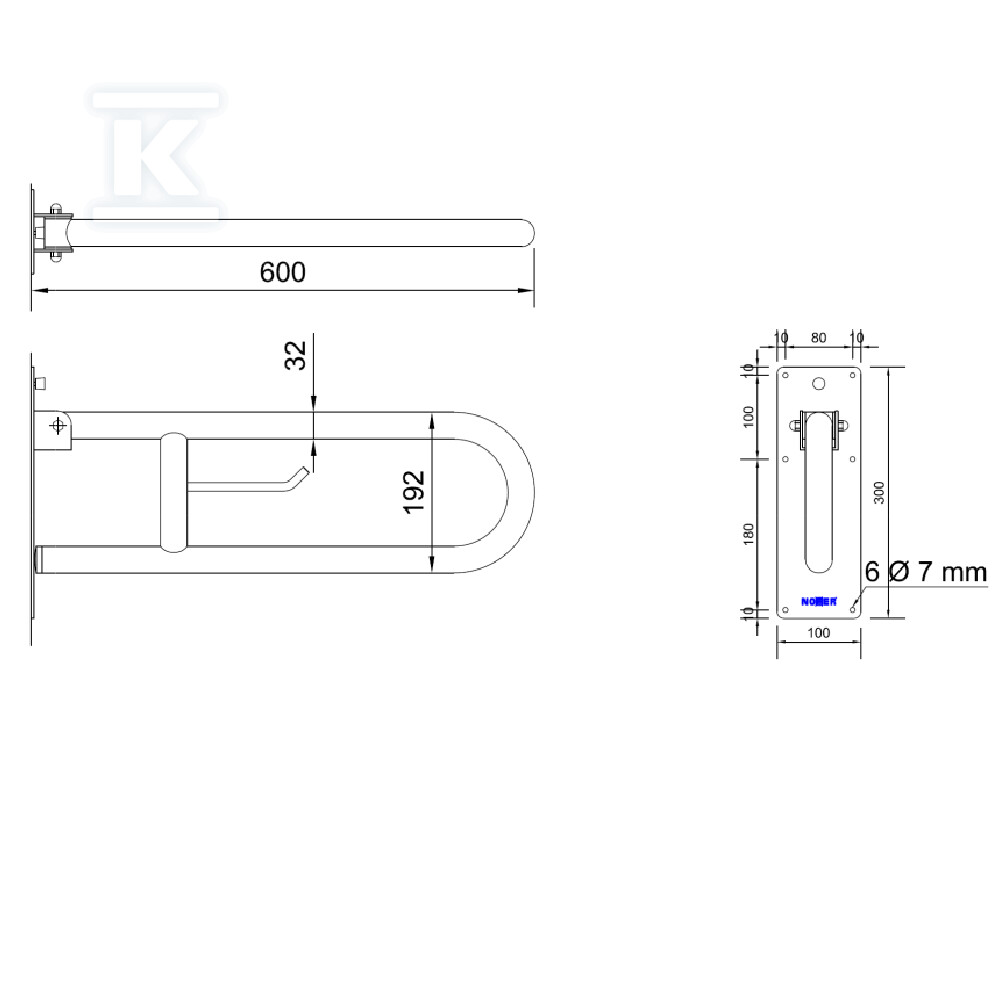 Поручня довжиною 600 мм має дугоподібну форму, що забезпечує зручний хват. Її діаметр становить 32 мм, а товщина сталі – 1,5 мм (труба) та 3 мм (кронштейн). Максимальне навантаження на поручню становить до 150 кг (залежно від джерела даних – деякі вказують 120 кг), що підтверджує її міцність і надійність. Відкидання вгору дозволяє вільно пересуватися у ванній кімнаті, коли поручня не потрібна. Зварювання TIG сталевих елементів гарантує міцні та естетичні з'єднання. Розміри у розкладеному вигляді: висота 192-250мм (різниці виникають з різних джерел), довжина 600мм та глибина 120мм.