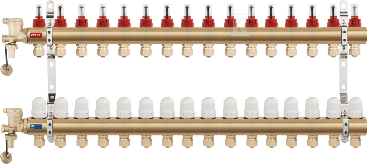 Роздільник оснащений 13 виходами, що дозволяє підключити до тринадцяти опалювальних контурів. На живильній балці розташовані витратоміри, що дозволяють точно регулювати потік води в діапазоні 0-2,5 л/хв. Завдяки цьому можна адаптувати кількість тепла, що подається в кожну кімнату, оптимізуючи термічний комфорт та зменшуючи експлуатаційні витрати. Повертаюча балка має термостатичні клапани з ручками для ручного регулювання – з можливістю подальшого монтажу термоелектричних головок M30x1,5 для автоматичного контролю температури. Додатково, в комплекті знаходяться групи відвідного-зливного типу з автоматичним відвідником повітря та зливним клапаном з латунною кінцівкою для шланга – що полегшує обслуговування та видалення повітря з інсталяції.