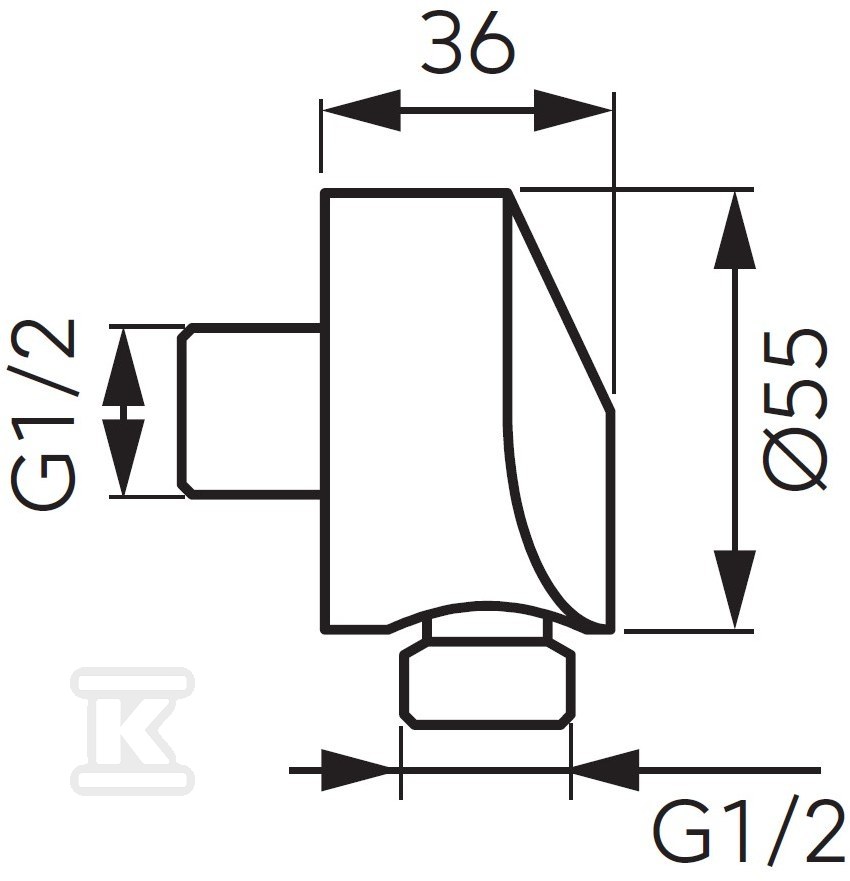 Корпус з'єднання виготовлений з латуні – матеріалу, який цінується за свою міцність та стійкість до дії води та інших зовнішніх факторів. Різьба G1/2” забезпечує сумісність з більшістю стандартних шлангів для душу, доступних на ринку. Компактні розміри (36 мм довжини та 55 мм ширини) дозволяють здійснити непомітний монтаж, а кутова конструкція полегшує підключення у місцях з обмеженим простором.