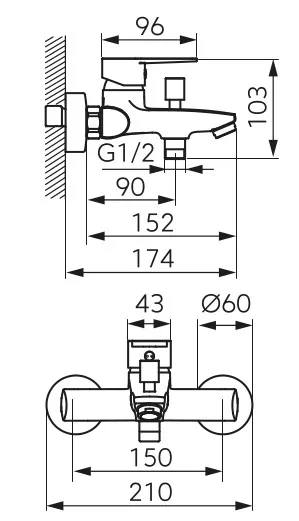 - Стандартний монтаж: легке встановлення завдяки ексцентриковим приєднанням G1/2 з відстанню 150 ± 20 мм.