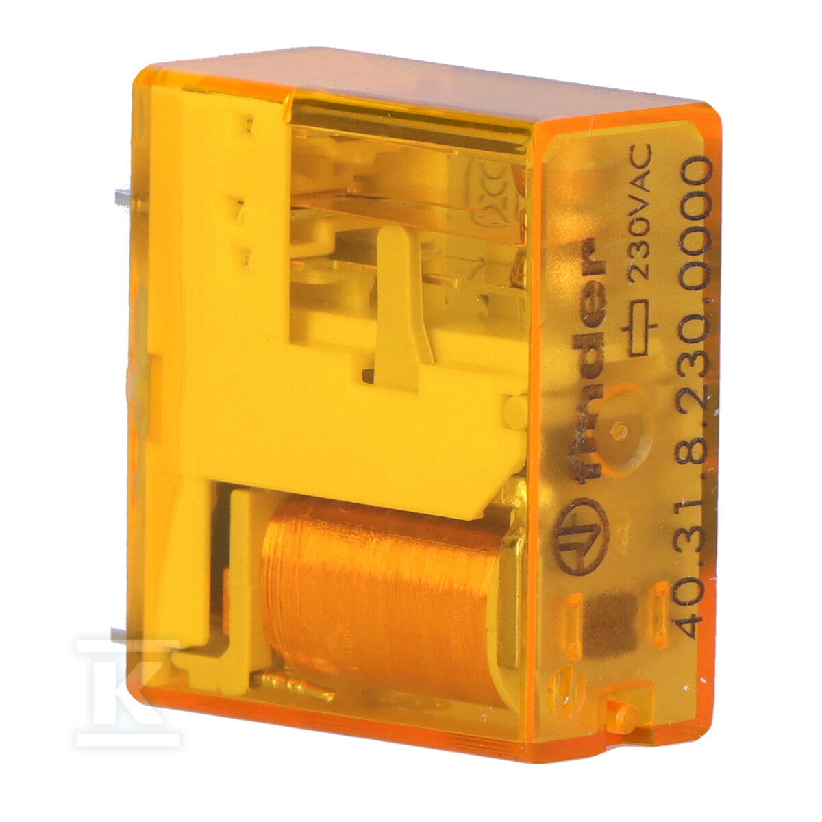 Електромагнітне реле, растр 3,5 мм, один перемикаючий контакт 1P навантаження 12A, котушка AC 230V 50/60Hz довжина штиря 5,3 мм для розеток, матеріал контактів AgNi