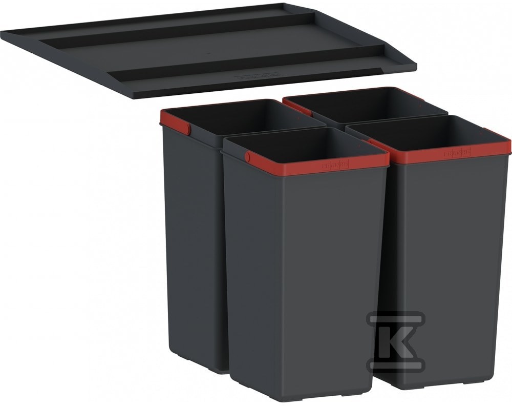 Сортувальник має чотири контейнери об’ємом 7,4 літра кожен, що дає загальну місткість 30 літрів. Його зовнішні розміри (378 x 414 x 343 мм) роблять його придатним для більшості стандартних кухонних шафок з мінімальною шириною 45 см. Для правильного монтажу в шафці під мийку рекомендується докупити універсальне подовження (доступне окремо). Міцне виконання гарантує довговічність та надійність пристрою – це підтверджує дворічна гарантія виробника.
