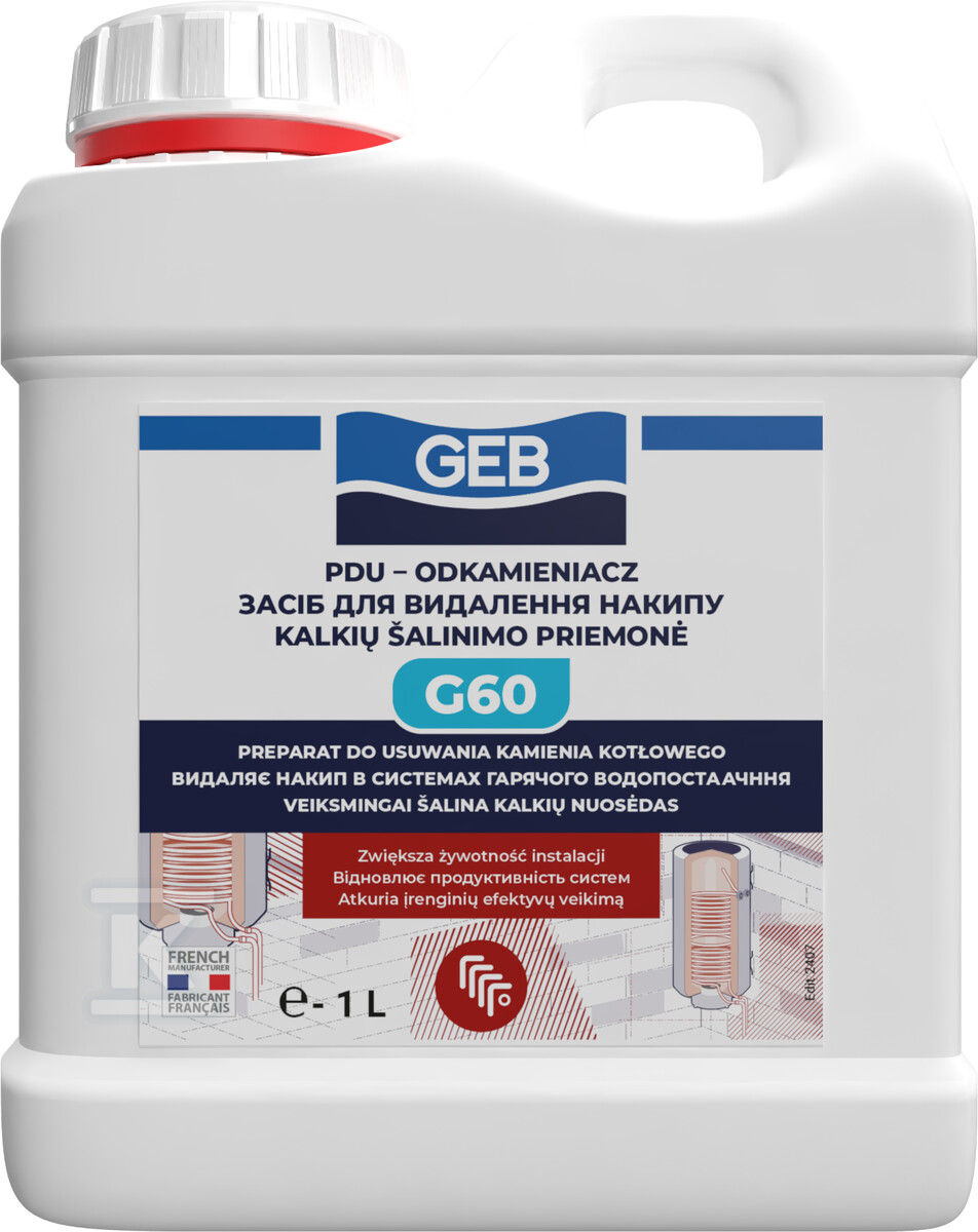 PDU G60 простий у використанні і не потребує спеціального обладнання. Його можна використовувати як у чистому вигляді, так і розбавленим, залежно від ступеня забруднення установки. У разі сильних відкладень накипу рекомендується повторити процедуру. Продукт змінює колір на коричневий у міру насичення накипом – це знак, що він діє! Після завершення видалення накипу варто застосувати нейтралізатор G70, щоб відновити відповідний pH води в установці та захистити її від корозії. Витрата препарату становить 1 літр на 100 літрів води.