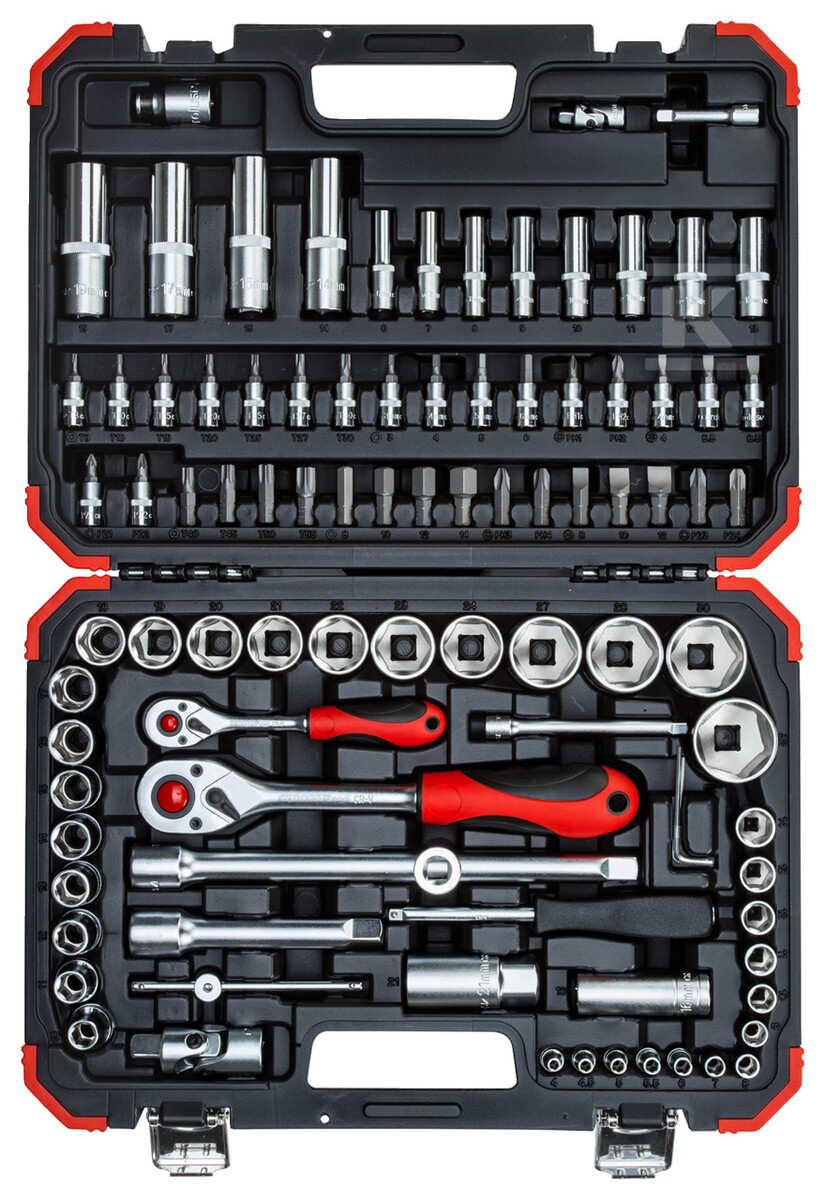 До складу набору входять насадки, тріскачки, подовжувачі, шарніри Cardana та адаптери, що покривають найпопулярніші розміри та профілі гвинтів. Доступні насадки 6-граннні метричні в розмірах 1/4" та 1/2", а також насадки для свічок запалювання. У наборі також є біти для шурупів (плоскі, хрестоподібні Phillips та Pozidriv та Torx), що робить його ще більш універсальним. Двонаправлені тріскачки з дрібним зубом дозволяють працювати у тісних просторах, а механізм перемикання напрямку полегшує відкручування навіть заблокованих гвинтів. Додані подовжувачі збільшують радіус дії інструментів, дозволяючи отримати доступ до важкодоступних місць.