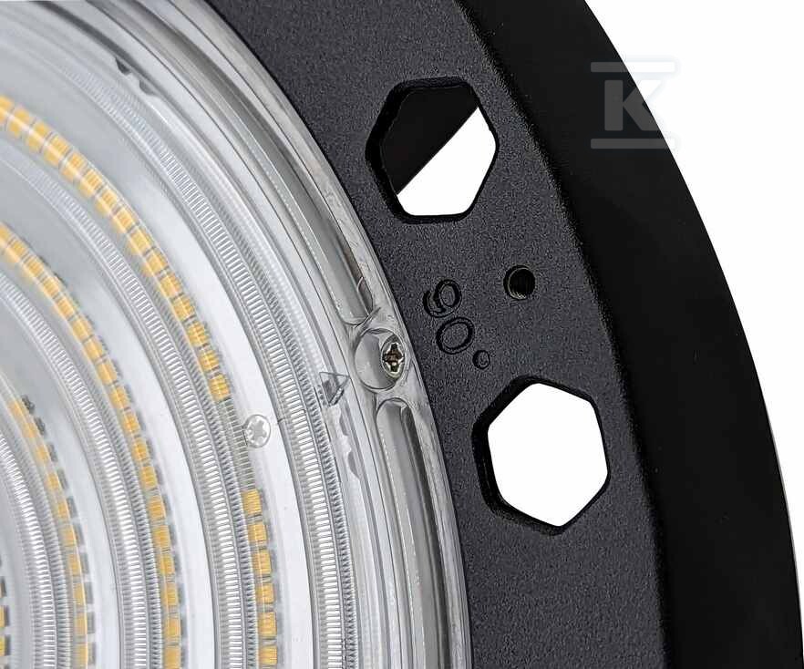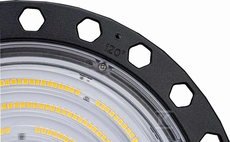 Кут освітлення також змінюється – без заміни рефлектора. Переміщення оптики дозволяє вибрати між 60°, 90° (за замовчуванням) або 120°. Тобто: вузький промінь на високих стелях, широкий на середніх складських просторах або розсіяне освітлення при нижчих конструкціях. Один світильник замінює три різні моделі.