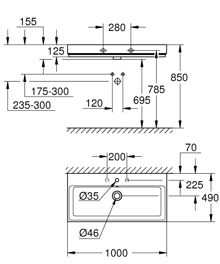 Настінне кріплення, 1 отвір під кран, 2 попередньо вирізані отвори, з переливним отвором, 1010 x 490 мм, сантехнічна кераміка, антибактеріальне покриття PureGuard, покриття, яке легко миється, колір альпійський білий