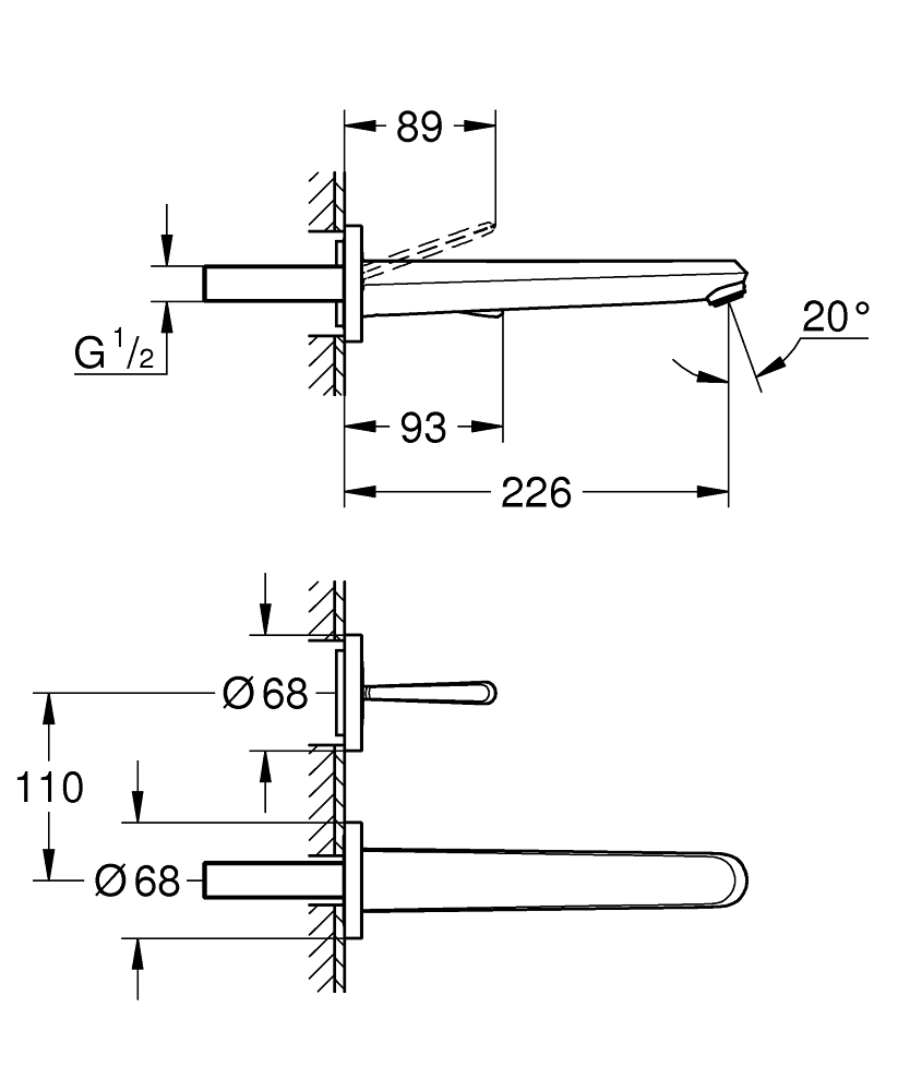 Настінне кріплення, для монтажу за допомогою врізної частини (замовляється окремо) :, 23 429 000 (замовляється окремо), без врізних частин, металевий важіль, хромована обробка GROHE StarLight, аератор GROHE EcoJoy SpeedClean 5,7 л/хв, відстань між носиком і важелем 110 мм , виступ 226 мм, мін. рекомендований тиск 1,0 бар, колір хром