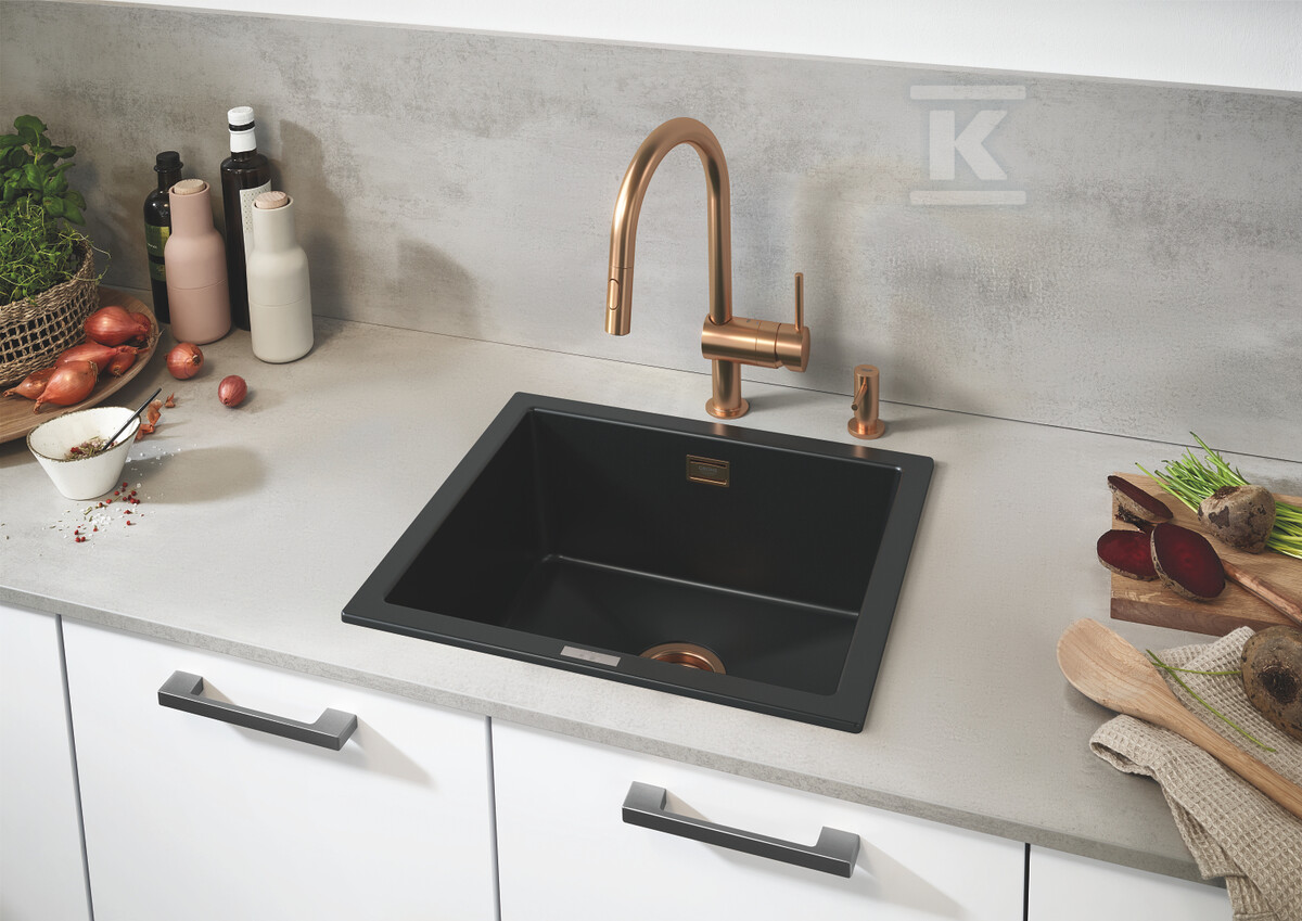 Цей елегантний змішувач для мийки з серії Minta поєднує в собі функціональність і сучасний дизайн. Оздоблення brushed warm sunset надає кухні теплий і стильний характер, а обертовий вилив з радіусом дії 360° забезпечує комфортне використання навіть у великих мийках. Змішувач ідеально підходить як для щоденного приготування їжі, так і для миття великого посуду.