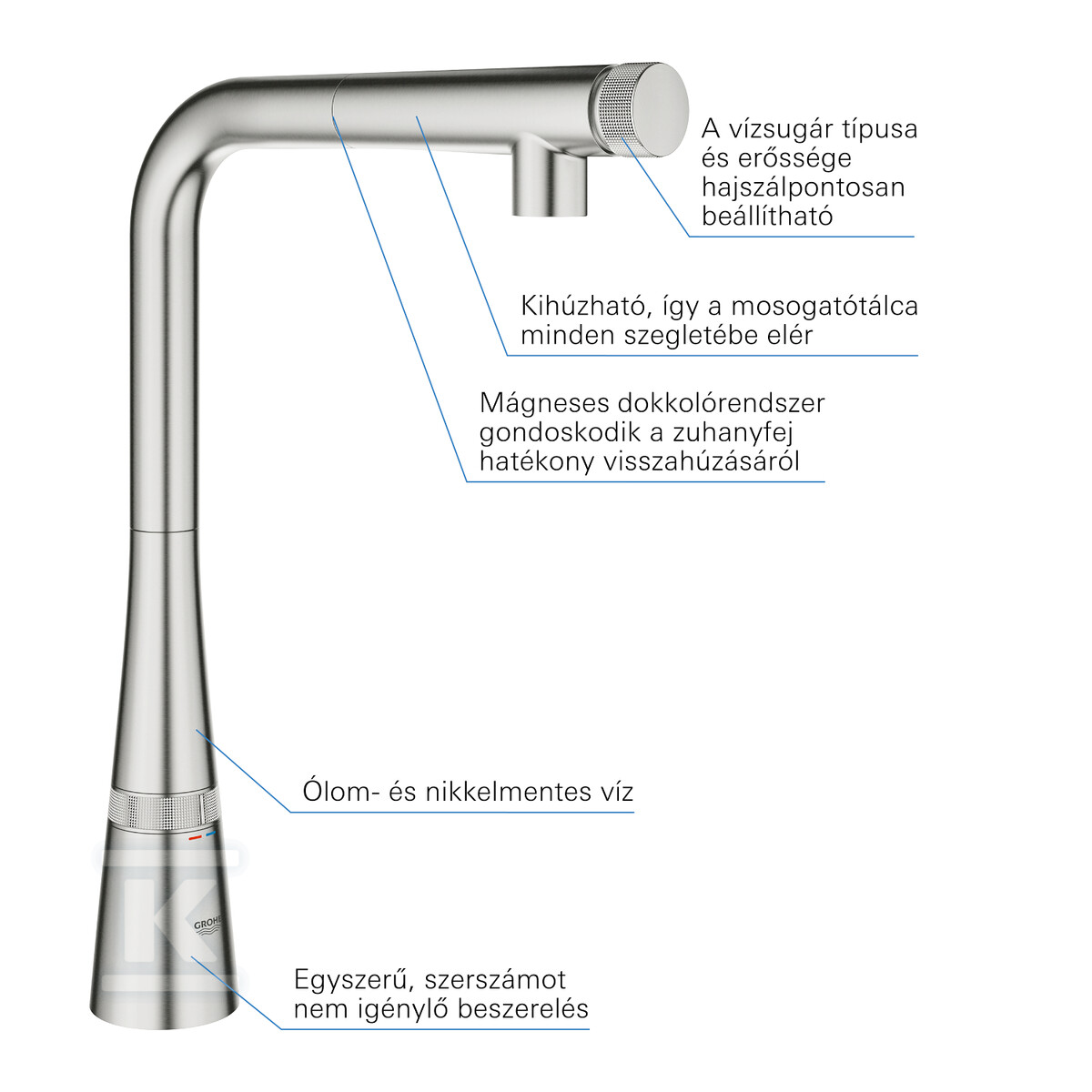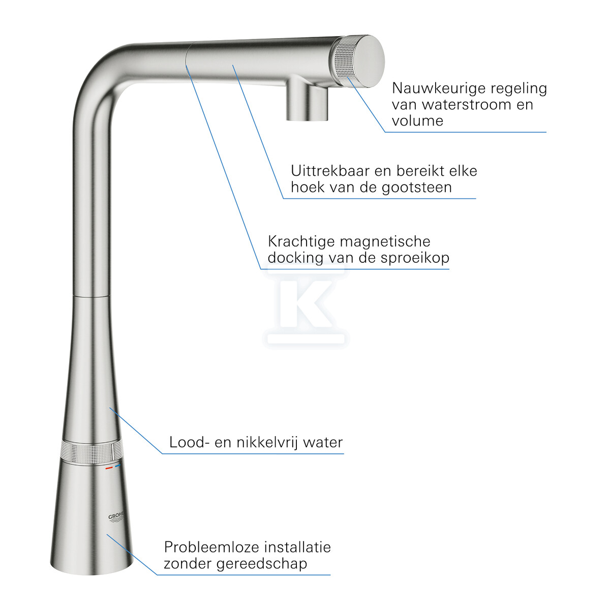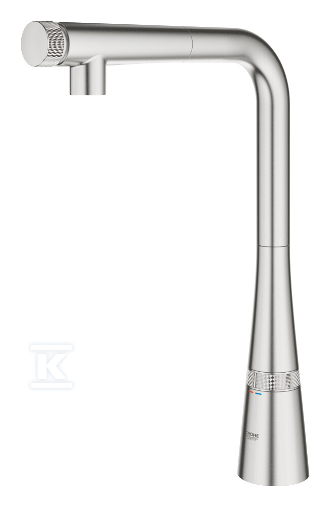 Zedra SmartControl Змішувач для мийки SmartControl, нержавіюча сталь, роздільні водяні канали, кут повороту виливу 140°, висувний вилив, кільце на корпусі для регулювання температури та тиску 31593DC2