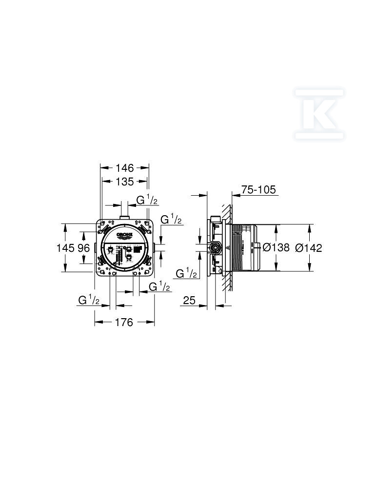 SmartBox характеризується стабільною оболонкою та захисною кришкою, забезпечуючи безпеку під час монтажних та ремонтних робіт. Латунні приєднання гарантують довговічність та стійкість до корозії, а попередньо встановлене приєднання для промивання полегшує обслуговування інсталяції. Підготовлені монтажні отвори дозволяють швидко та точно встановити як у стінах з сухої застройки, так і в традиційних мурах. Глибина інсталяції в діапазоні 75-105 мм забезпечує сумісність з різними типами стін.