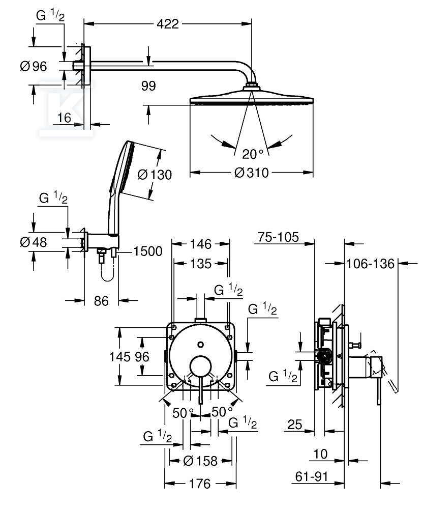 До складу набору входять усі необхідні елементи для створення комфортної душової зони: одноважільний прихований змішувач для керування двома виходами води, універсальний прихований елемент GROHE Rapido SmartBox, душова лійка Rainshower Mono діаметром 310 мм з кронштейном 422 мм, триструменева душова лійка Rainshower SmartActive 130, душовий лікоть з тримачем та душовий шланг Silverflex довжиною 1500 мм. Додатково, в комплекті є опціональний обмежувач потоку для душової лійки.