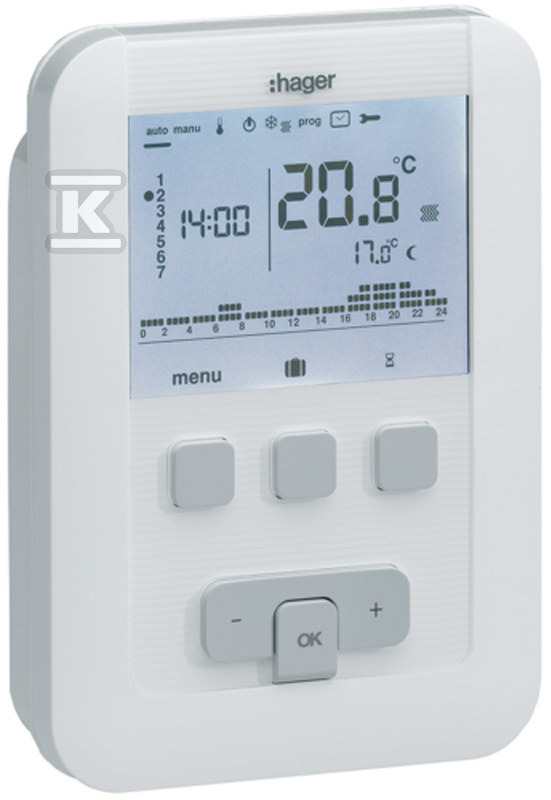 Цей цифровий термостат з годинником Hager EK520 є надійним рішенням для програмування та контролю температури в приміщеннях. Завдяки живленню від батарейок, забезпечує гнучкість монтажу та використання, усуваючи необхідність прокладання кабелів живлення. Це ідеальне рішення як для монтажників, так і для кінцевих користувачів, які шукають простий у використанні та ефективний пристрій для управління опаленням.