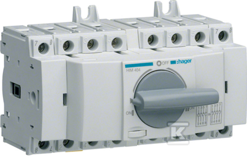 Перемикач HIM404 характеризується гвинтовим з'єднанням головних контактів та короткою поворотною ручкою для зручного керування. Його конструкція забезпечує захист IP20 з лицьової сторони. Пристрій пристосований для роботи зі струмом короткого замикання величиною 50 кА (умовний) та витримує імпульсний струм на рівні 1.26 кА. Колір елементу керування – сірий, що полегшує ідентифікацію в розподільній шафі. Номінальний постійний струм для AC-21 при 400V становить 40A, а для AC-23 також 40A.