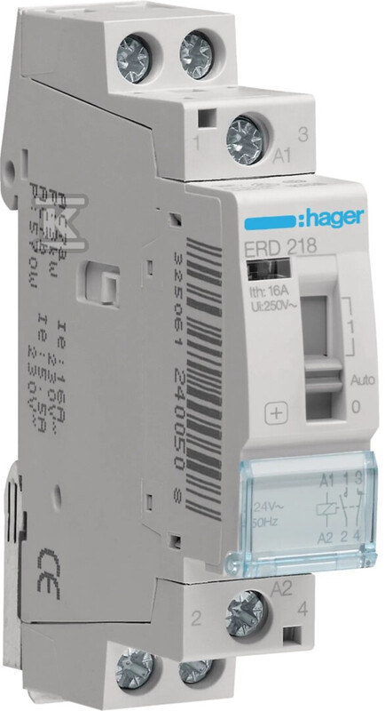 Реле ERD218 характеризується номінальною робочою напругою 230V, номінальним робочим струмом 16A та керуючою напругою AC 24V. Воно має один розмикаючий контакт (NO) та один замикаючий контакт (NC), а його глибина вбудовування становить 60mm.