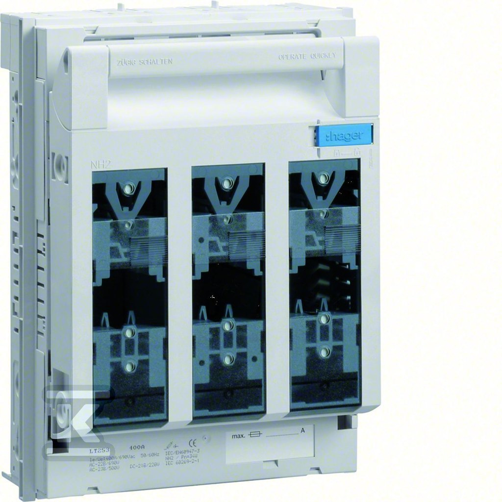 Цей триполюсний роз'єднувач запобіжний, призначений для співпраці з вставками NH2 струмом 400A, є ключовим елементом захисту електричного. Забезпечує ефективний захист від наслідків коротких замикань і перевантажень в інсталяціях з напругою до 690VAC. Конструкція живлення/відтоку на гвинт M10 і шини 60mm полегшує інтеграцію з існуючими системами.
