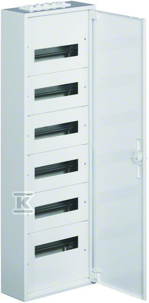 Розподільна коробка пропонує місце для аж 72 модулів (6 рядів по 12 модулів), що дозволяє гнучко адаптувати її до потреб конкретної установки. Виготовлена з міцної сталі з білим (RAL 9010) покриттям, забезпечує довговічність та естетичний вигляд. Має двері, що забезпечують доступ до внутрішнього простору, та клемну колодку заземлення для підвищення безпеки. Відсутність замка та прозорої кришки/дверей є характерними ознаками цієї моделі. Клас захисту IP30 гарантує базовий захист від проникнення твердих тіл.