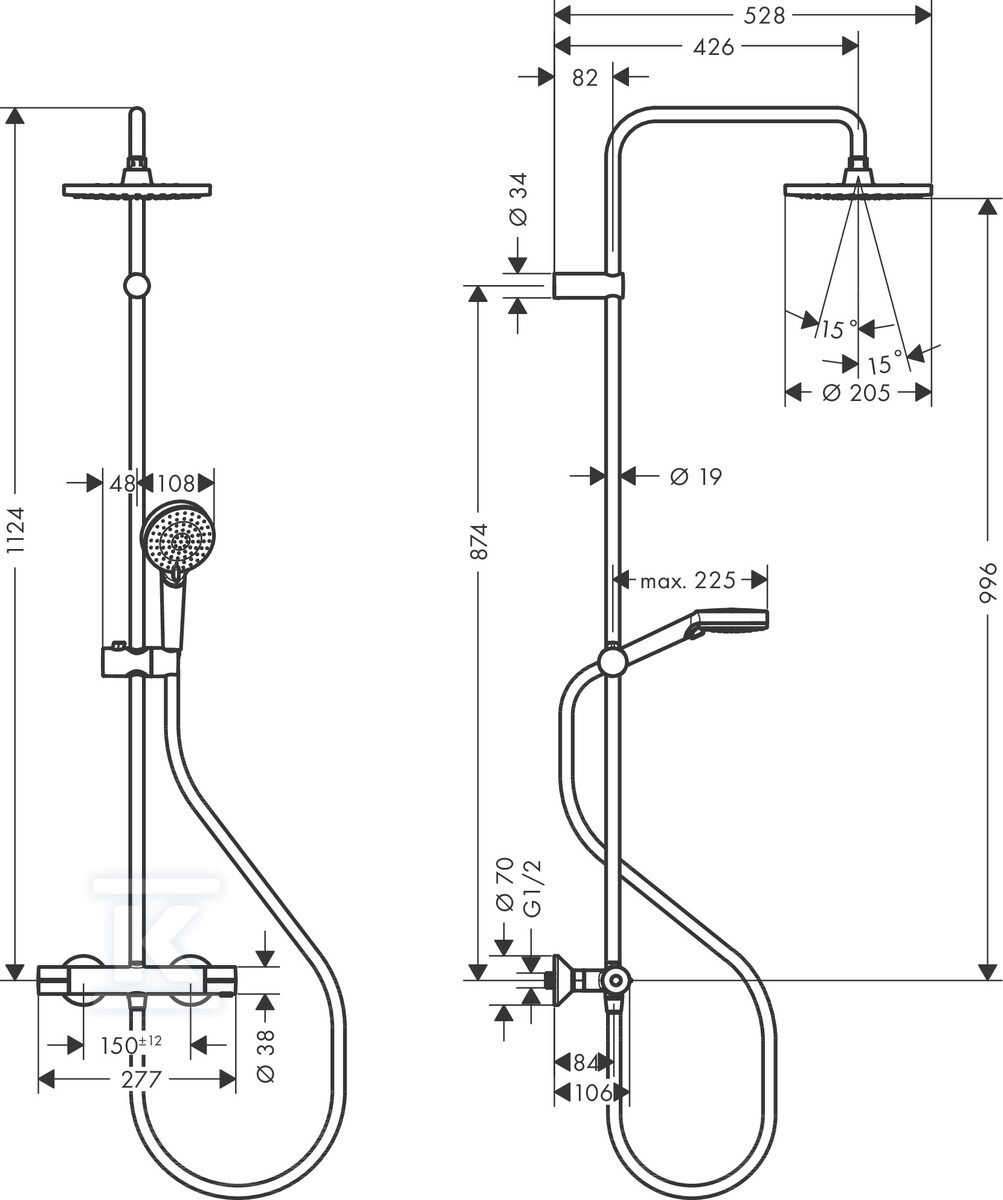Головка душу діаметром 205 мм створює струмінь Rain — широкий, м’який і рівномірний, як природний дощ. Додатково, ручна головка пропонує вибір між струменем Rain та IntenseRain, дозволяючи легко переключатися між ніжним оприскуванням та інтенсивнішим масажем. Обидва розподільники працюють незалежно — вони не можуть використовуватися одночасно, що запобігає падінню тиску та забезпечує стабільний потік.