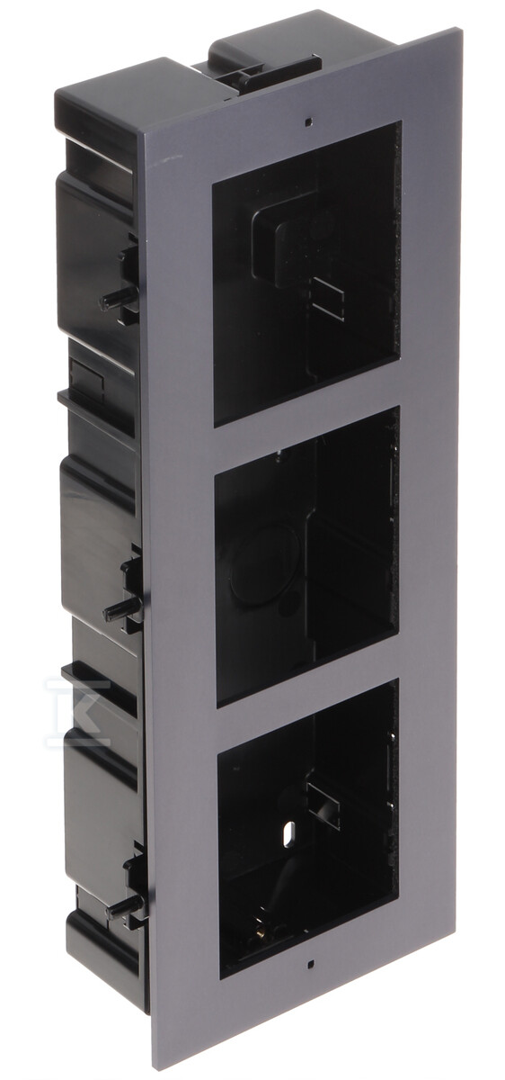 Цей комплект є повним рішенням для прихованого монтажу модульної станції брами Hikvision, призначеної для систем відеодомофонів другого покоління. До складу комплекту входить міцна алюмінієва монтажна рамка на 3 модулі, адаптована пластикова підрозеткова коробка та необхідне кабелювання. Комплект забезпечує естетичний і надійний монтаж елементів системи, приховуючи дроти в стіні.